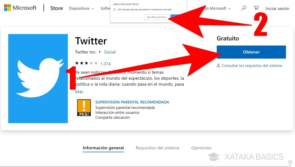 En cuanto a cómo descargarlas, realmente se hace como cualquier otra aplicación. Si abres la URL de la App en tu navegador, lo único que tienes que hacer es pulsar el botón de Obtener o Instalar (1). Entonces, tu navegador detectará que tienes en Windows 10 la tienda de aplicaciones, y te preguntará si quieres abrirlo allí. En el diálogo que te aparezca pulsa el botón Abrir Microsoft Store (2).